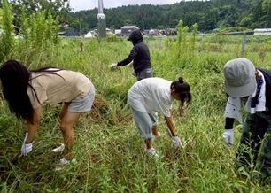 公民館で引き続きボッチャを行うほか、輪島市立大屋小学校仮設住宅裏庭では草引きをしました。元々、小学校の畑があった場所であり、現在荒れ地となっています。住民と一緒に草引きをし、畑をどうしたいかなどの話をお聞きすることができ、有意義な時間となりました。