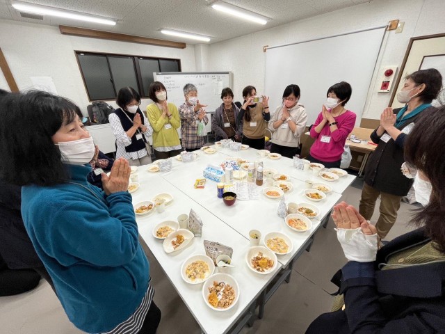 16名が参加し、ポリ袋クッキングやアルファ米の食事、断水を想定したトイレ体験など、被災時の生活を疑似体験。